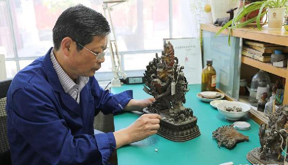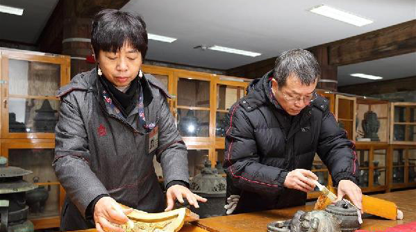 故宮工作人員修復文物(資料照片)。故宮博物院經(jīng)過三年藏品清理工作,增加了55132件登記藏品,涉及乾隆御稿、尺牘、甲骨、陶瓷等種類文物、標本。這些新“上戶口”的藏品已于3月15日起在延禧宮展覽