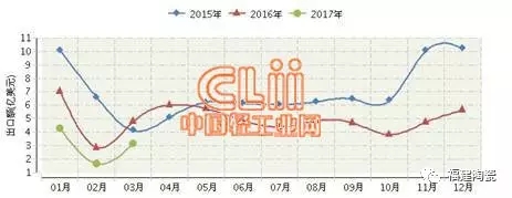 據(jù)海關(guān)數(shù)據(jù)顯示,2017年一季度我國陶瓷磚出口量價(jià)繼續(xù)回落,其中出口額下降幅度依然高于出口量降幅。據(jù)海關(guān)數(shù)據(jù)顯示,2017年1~3月我國陶瓷磚累計(jì)出口金額9.12億美元,同比下降38.22%;出口量1.83億平方米,同比下降11.40%。從連續(xù)三年月度出口額對比情況看,2017年一季度各月出口額均低于上兩年水平。