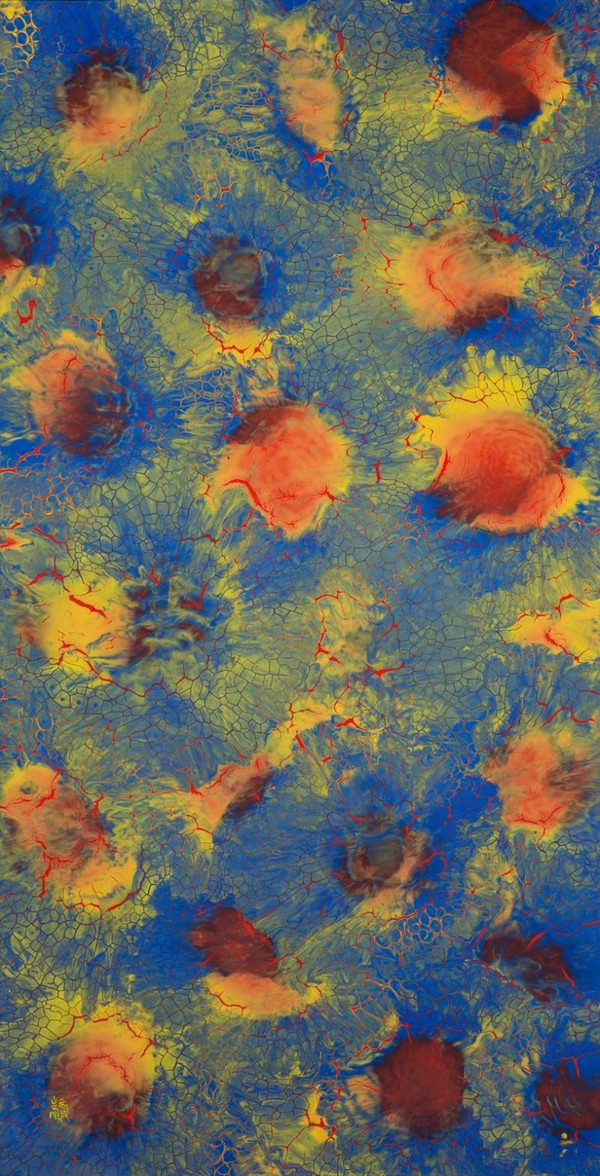 在朱的諸多作品中,我們都可以看到一些極為抽象的符號(hào),仿佛來自宇宙深處的影子。高溫顏色釉經(jīng)過窯變所呈現(xiàn)的自然流淌、融合的肌理與色彩使得這些抽象的符號(hào)渾然天成,他試圖以此來呈現(xiàn)他主觀意念中萬物存在的本象。而這“象”是無形之象,是尋味之象,正因此,觀者被不由自主地引入一種超越法度之外的開闊境地里,仿佛游弋于一個(gè)無關(guān)極限的場域。
