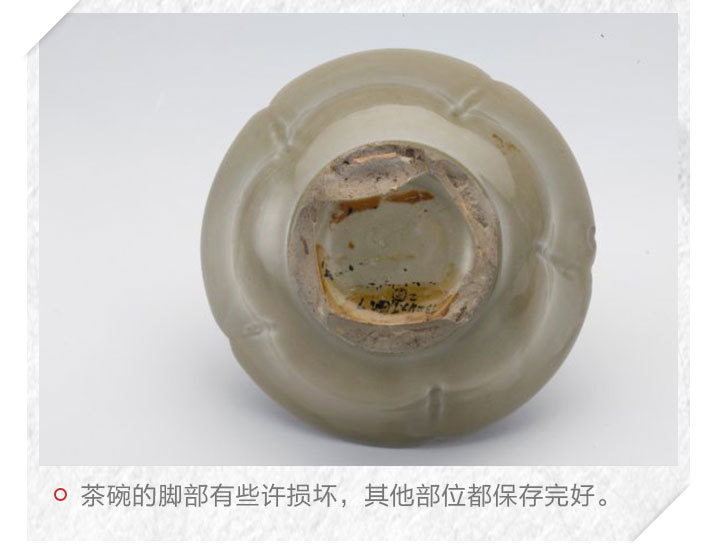 據(jù)考證,這套唐秘色瓷荷花托盞制作的年份是唐大中二年,已屬晚唐。經(jīng)過清理,這套荷花托盞的茶碗口沿作五瓣花口弧形,外壁壓出內(nèi)凹的五條棱線,形成五個(gè)花瓣的界線效果,猶如一朵盛開的蓮花般剔透。茶盞內(nèi)外素面無紋,光潔無比。除了杯腳有些許破損外,其他位置都光亮如新。