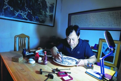 刻瓷是“以刀代筆”在瓷盤上進行創(chuàng)作。