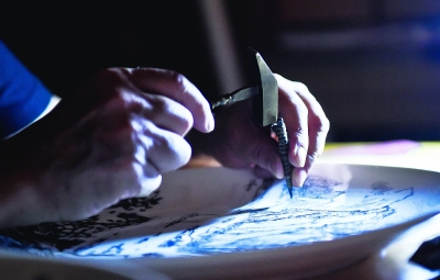 刻瓷,顧名思義,就是用陶瓷作為載體,以刀代筆,在陶瓷上進行雕刻創(chuàng)造的藝術(shù)形式?檀伤囆g(shù)最顯著的特點,就是硬碰硬,一刀下去便不能更改。操作時用力重則易刻偏,用力輕則不成像。所以,刻瓷不但要有深厚的美工基礎(chǔ),還要有穩(wěn)準狠的刀工技藝。