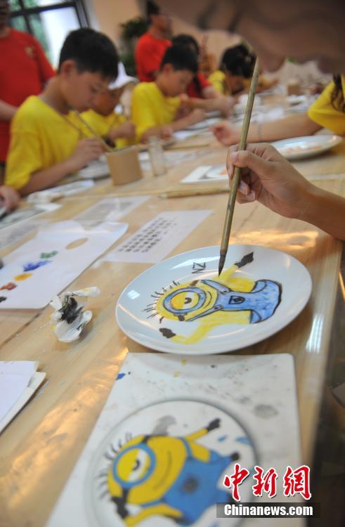 一位華裔青少年在一塊瓷盤上創(chuàng)作“小黃人”動(dòng)畫形象。 劉占昆 攝
