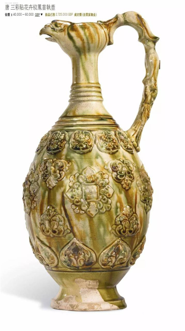 最近兩年拍賣(mài)市場(chǎng)上出現(xiàn)過(guò)一件明星級(jí)別的鳳首壺。2015年5月倫敦蘇富比春拍,一件將近37厘米高的三彩貼花卉紋鳳首執(zhí)壺以2,725,000英鎊,折合人民幣約2630萬(wàn)的天價(jià)成交,由英國(guó)著名古董商Eskenazi買(mǎi)回。Eskenazi這個(gè)名字相信大家很熟悉,當(dāng)年引爆國(guó)內(nèi)元青花熱潮的標(biāo)志性事件——2005年倫敦佳士得的元青花鬼谷子下山大罐以折合人民幣2.3億的價(jià)格成交,就是出自他的手筆。這件蘇富比的拍品可以說(shuō)代表了鳳首壺這個(gè)品種中的最高工藝和藝術(shù)水準(zhǔn),體量夠大,品相較好,加上有Eskenazi和繭山龍泉堂(日本著名的古董收藏經(jīng)營(yíng)機(jī)構(gòu))的來(lái)源加持,又有《世界陶瓷全集》這種權(quán)威級(jí)別的出版記錄,市場(chǎng)追捧到這個(gè)價(jià)格也就不足為奇了。
