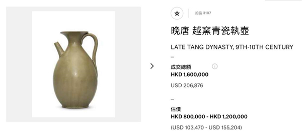 2016年6月香港佳士得拍出一件晚唐越窯青釉執(zhí)壺,成交價(jià)為160萬(wàn)港幣,可做參考。