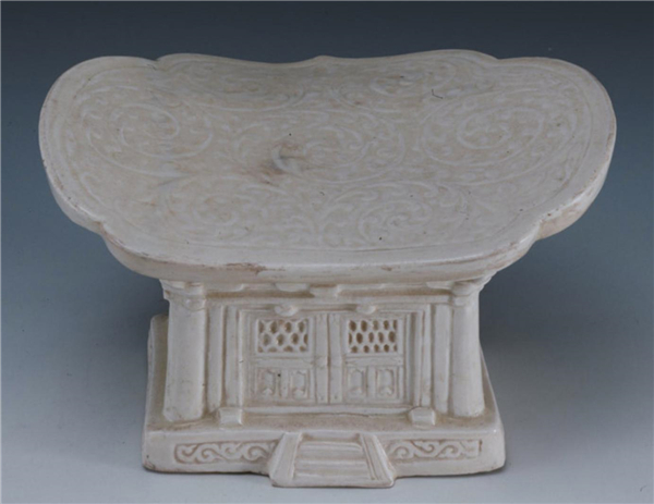 這件瓷枕通體施白釉,釉面滋潤(rùn),聚釉處呈淡水綠色,玻璃質(zhì)光很強(qiáng),胎體細(xì)膩潔白。枕面作如意頭形,其上刻滿(mǎn)密而流暢的纏枝花卉紋,兩側(cè)微上翹,下承仿木結(jié)構(gòu)建筑的宮殿形平座,門(mén)窗門(mén)拱、基址臺(tái)階均雕刻得形象逼真,殿宇前門(mén)緊閉,后門(mén)半開(kāi),一人側(cè)立于門(mén)前,造型別致,獨(dú)具匠心。
