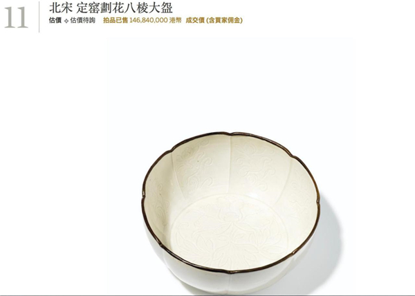 值得一提的是,雖然印花器是定窯的最著名品種,但目前定窯的拍賣(mài)紀(jì)錄保持者是一只劃花產(chǎn)品。2014年4月蘇富比香港拍出了一件定窯劃花八棱大碗,為日本著名古董商坂本五郎舊藏,成交價(jià)為146,840,000港元,為目前定窯產(chǎn)品中的最高價(jià)。