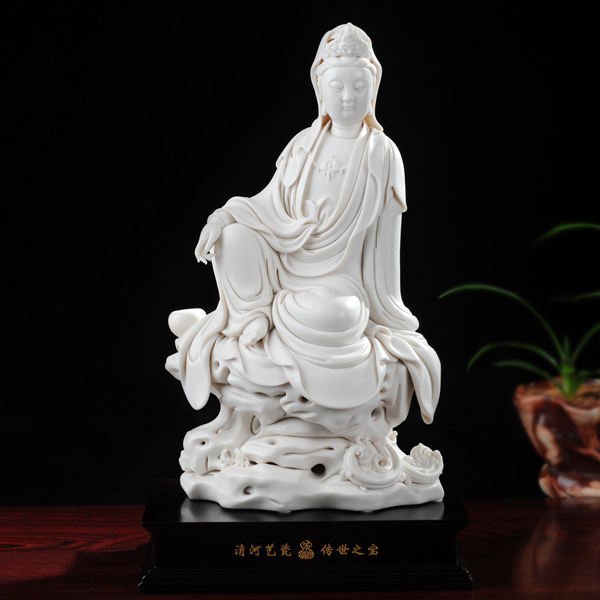 作品采用上等德化白瓷泥,經(jīng)1300多度高溫燒是,觀音一改佛教造像直立或打坐的成規(guī),右腿曲蹲,左腳盤坐巖石,重心落在左胯,右手悠然自在輕放于右膝之上,左手為支撐點,無拘無束,自由自在。其姿態(tài)出色地突現(xiàn)了觀音流暢的線條和優(yōu)美的身段。
