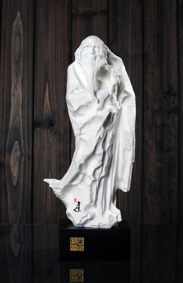當代德化實力派陶藝家鄭志德作品代表作品。作品以德化溫潤如玉的“中國白”為胎質(zhì),手工制作,胎骨潔白,堅實致密,有凝脂似玉之感?鬃由碇L袍,面相莊重慈祥、沉靜肅穆。作品工藝精湛,衣紋流暢飄逸,體態(tài)豐隆,把孔子雕刻得活靈活現(xiàn),并與歷史記載中“溫而厲,威而不猛,恭而安”的形象吻合。