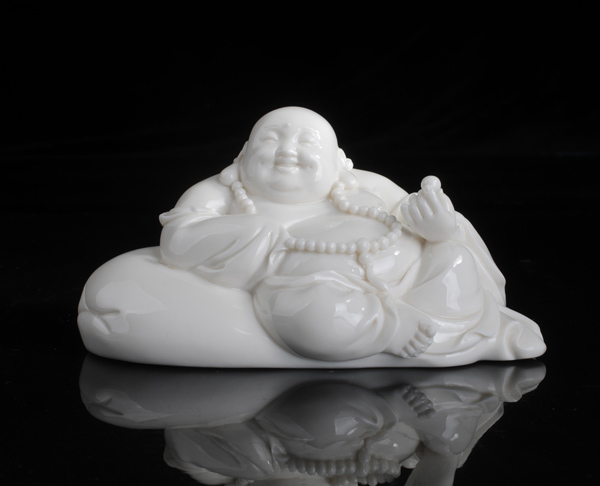 作品采用上等德化白瓷泥,經(jīng)1300多度高溫燒是,觀音一改佛教造像直立或打坐的成規(guī),無拘無束,自由自在。其姿態(tài)出色地突現(xiàn)了觀音流暢的線條和優(yōu)美的身段。