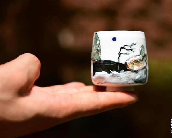呂錫良在展示他的陶瓷制品《南山》(8月15日攝)。新華社記者 邵瑞攝