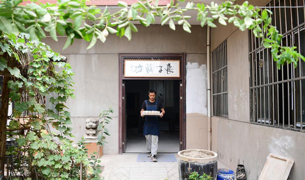 呂錫良端出完成彩繪的泥坯,準(zhǔn)備裝窯素?zé)?月1日攝)。新華社記者 邵瑞攝