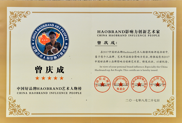 近日,由好品牌網、西北品牌營銷聯盟、生產力學會策劃專家委員會、亞太好品牌實驗室、民營企業(yè)發(fā)展戰(zhàn)略研究院、百城聯盟文化產業(yè)聯合會、華人頻道、全球好書畫網、等機構聯合主辦中國好品牌藝術人物網絡評選活動(Haobrand藝術人物排行榜)在本次的評選活動中,根據曾慶成個人品牌、藝術作品綜合影響力突出等,被評選為2017年中國好品牌品牌影響力創(chuàng)新藝術家!
