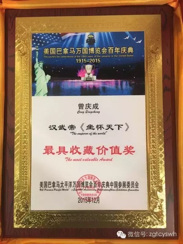 2015年,作品漢武帝《坐懷天下》在美國巴拿馬萬國博覽會百年慶典獲得“巴拿馬最具收藏價值獎”