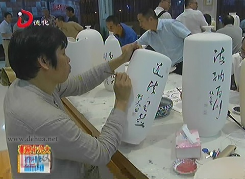 采風(fēng)活動(dòng)通過座談交流和現(xiàn)場創(chuàng)作的形式進(jìn)行,在中國瓷板畫寫生創(chuàng)作基地創(chuàng)作現(xiàn)場,“白如雪,潤如玉”的中國白陶瓷激起了書畫家們的創(chuàng)作熱情,他們紛紛揮毫潑墨,在瓷板上、瓷瓶上用一幅幅筆酣墨寶、行云流水的書法、書畫作品來表達(dá)各自對黨十九大勝利召開的喜悅之情。交流創(chuàng)作中,書畫家們通過書畫與陶瓷藝術(shù)相結(jié)合,為“中國白”添上書香韻味,讓書畫和瓷器這兩種傳統(tǒng)藝術(shù)元素交匯碰撞、相得益彰。