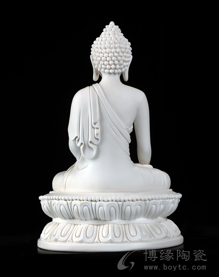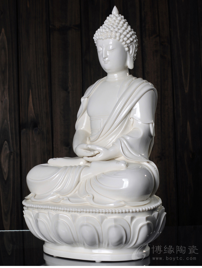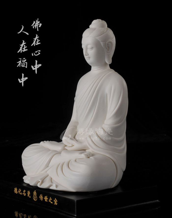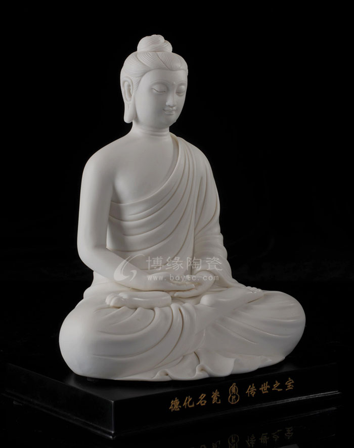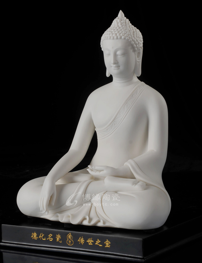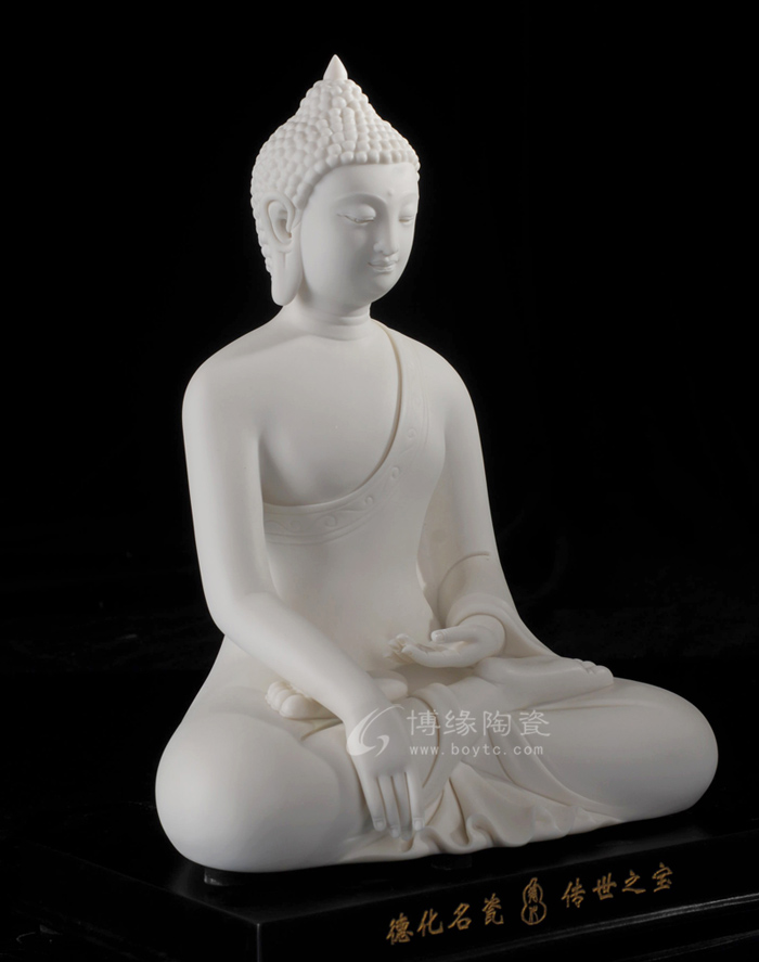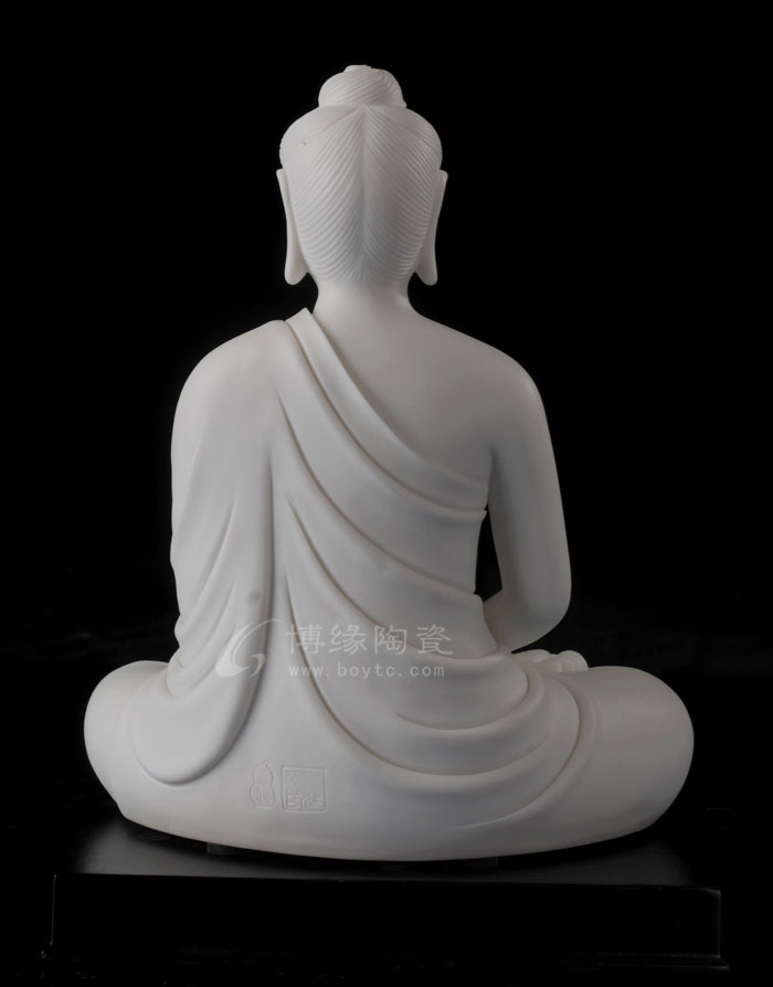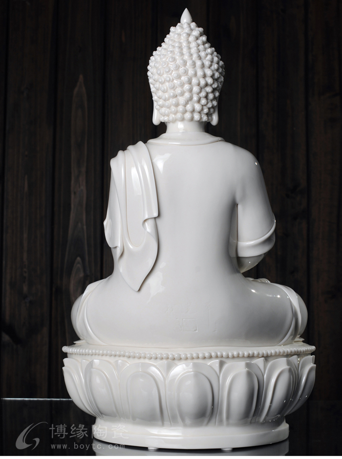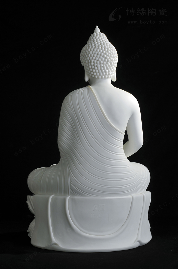 《釋迦牟尼佛》作品以德化特有溫潤(rùn)如玉的“中國(guó)白”為胎質(zhì),純手工制作,一千三百度高溫?zé)贫。作者技法嫻熟利落,精雕?xì)刻,把作品釋迦牟尼的面部,手部,各個(gè)細(xì)節(jié)都雕刻的細(xì)致入微,釋迦牟尼佛慈眉善目,蓮眼低垂,手指圓潤(rùn)有利,玉潤(rùn)細(xì)膩,立意妙雅純粹,造型別致新穎,衣物線條自然,紋理清晰,形象栩栩如生,作品給人以素雅,自然,靜心的感覺(jué)。作品背部有大師落款,具有較高的收藏、鑒賞價(jià)值。