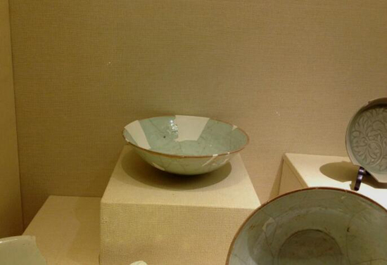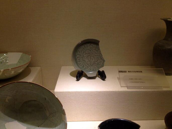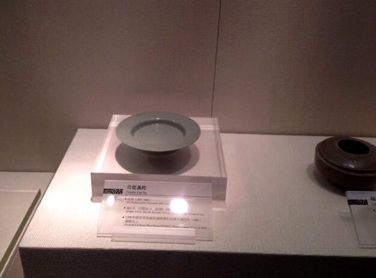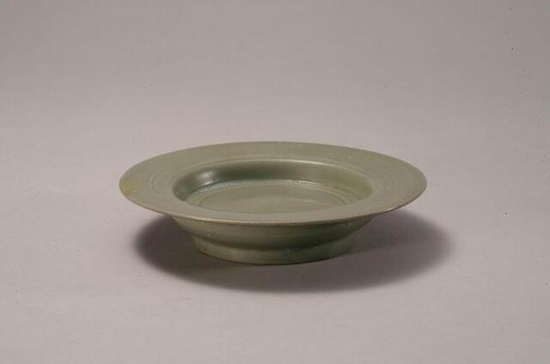 寬折沿,弧腹,圈足。折沿上飾二道凹弦紋。托心內(nèi)凹,腹淺,足稍外撇。通體施釉,釉色青綠、滋潤。底有六處支燒痕。器形簡潔規(guī)整,造型別致。