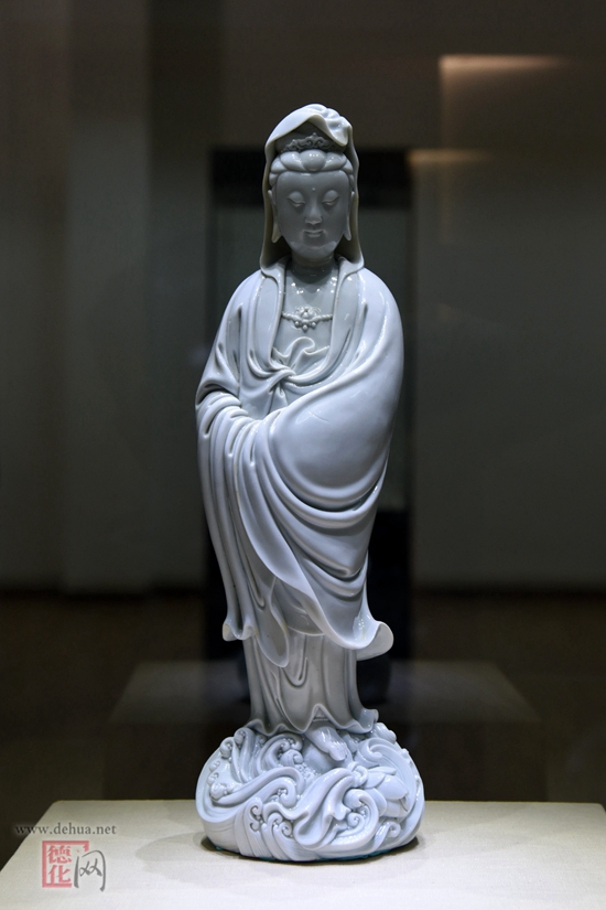 一進縣陶瓷博物館二樓展廳門,只見一尊“渡海觀音”映入眼簾,標簽顯示高有 47厘米,精雕細刻,線條流暢,衣紋自然、飄逸,溫潤如玉,更展現(xiàn)其純凈、高雅的“東方女神”之魅力,令人嘆為觀止。
