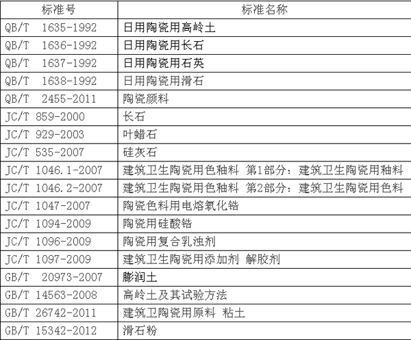 目前陶瓷相關(guān)標(biāo)準(zhǔn)已經(jīng)基本覆蓋包括建筑衛(wèi)生陶瓷、日用陶瓷、工藝美術(shù)陶瓷、特種陶瓷、耐火材料、陶瓷水暖配件等各個(gè)領(lǐng)域的產(chǎn)品、檢驗(yàn)方法、原料等各個(gè)環(huán)節(jié)。在此僅針對(duì)陶瓷原料標(biāo)準(zhǔn)進(jìn)行簡(jiǎn)單討論,因?yàn)楫a(chǎn)品標(biāo)準(zhǔn)是陶瓷原料標(biāo)準(zhǔn)體系的核心內(nèi)容。下表是常用陶瓷原料的部分現(xiàn)行有效的國(guó)家標(biāo)準(zhǔn)和行業(yè)標(biāo)準(zhǔn):