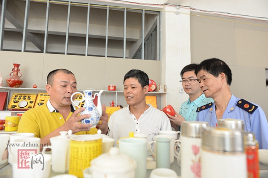 在福建省德化晶美陶瓷有限公司,9名工作人員在公司負責人陳為順陪同下,走進車間、樣品室等處,詳細了解公司生產(chǎn)經(jīng)營情況。“你們產(chǎn)品最好打上專利證號、版權登記證號,以免被他人仿冒,自己吃虧。” 市場監(jiān)管局工作人員陳佩飛說。科技局連周程補充:“如果疑似有人偽造你們的專利產(chǎn)品,要事先保存好證據(jù),隨時跟我們溝通。”人社局陳建華在檢查中發(fā)現(xiàn)該公司與個別工人未簽訂勞動合同,提醒道:“根據(jù)勞動法,入職超過1個月未滿1年未簽訂勞動合同的,需要向員工每月支付2倍的工資。”工商聯(lián)的小顏則忙著解讀《陶瓷同業(yè)公會誠信倡議書》。文體新局工作人員黃世雄建議晶美陶瓷加入版權保護協(xié)會,申請1件版權保護項目只需20元,比讓人代辦更實惠。各個部門的工作人員有條不紊地做好自己的分內(nèi)事。
