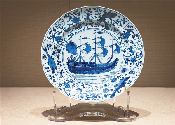 此次展出的清乾隆青花帆船圖花口盤(pán)就是外銷(xiāo)瓷中的精品。該盤(pán)既有“連生貴子”的中式紋樣,又有“中西結(jié)合”的三桅帆船,不僅具有極高的藝術(shù)價(jià)值,而且真實(shí)地反映古代航海和瓷器貿(mào)易歷史,有珍貴的史料價(jià)值。