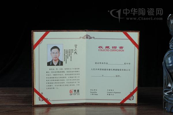 曾慶成,男,1975年8月出生于中國(guó)瓷都德化。畢業(yè)于景德鎮(zhèn)陶瓷學(xué)院雕塑藝術(shù)設(shè)計(jì)。學(xué)歷:大專,中國(guó)陶瓷藝術(shù)名家、福建省工藝美術(shù)師,1993年到鳳池陶瓷研究所拜師學(xué)藝,經(jīng)陳明良大師細(xì)心指導(dǎo),雕塑技藝得到很大提升。后又被中國(guó)工藝美術(shù)大師黃泉福收為徒弟。經(jīng)不斷刻苦學(xué)習(xí),潛心研究瓷塑藝術(shù)與創(chuàng)作,短短數(shù)年,取得了不少的成果。2011年創(chuàng)辦了《德化縣博盛禮品有限公司》,F(xiàn)為中國(guó)陶瓷藝術(shù)大師,高級(jí)工藝美術(shù)大師,中國(guó)國(guó)際工藝美術(shù)協(xié)會(huì)會(huì)員,福建省古玩商會(huì)理事,2014大愛(ài)歸來(lái)公益活動(dòng)組委會(huì)高級(jí)顧問(wèn),中國(guó)白藝術(shù)瓷王者風(fēng)范、中華五帝作品創(chuàng)作第一人。多件作品被省、市博物館收藏,個(gè)別作品在國(guó)內(nèi)外展覽中榮獲金、銀、最具收藏價(jià)值獎(jiǎng)等榮譽(yù)。