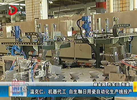 【同期聲 玉瓷發(fā)展股份有限公司董事長溫克仁:因為自生釉的技術,很適合于全自動的智能生產,現(xiàn)在我們引進這條自動生產線,一分鐘可以生產13個碗,13個的產品,整個24小時都可以運轉,能夠保證我們那條60米滾道窯的正常24小時的燒成,每天燒出碗的數(shù)量,按分鐘計算可以達到2萬多個,燒出來的整個效果非常好,實現(xiàn)機器換人,由于目前工人比較缺少,所以我們整條的生產線,現(xiàn)在只要在裝窯的位置上,再安排一個機器手,我們就調整一下,這樣就可以實現(xiàn)智能全自動的日用瓷生產。燒出的產品合格率都達到了百分九十七點幾的產品!