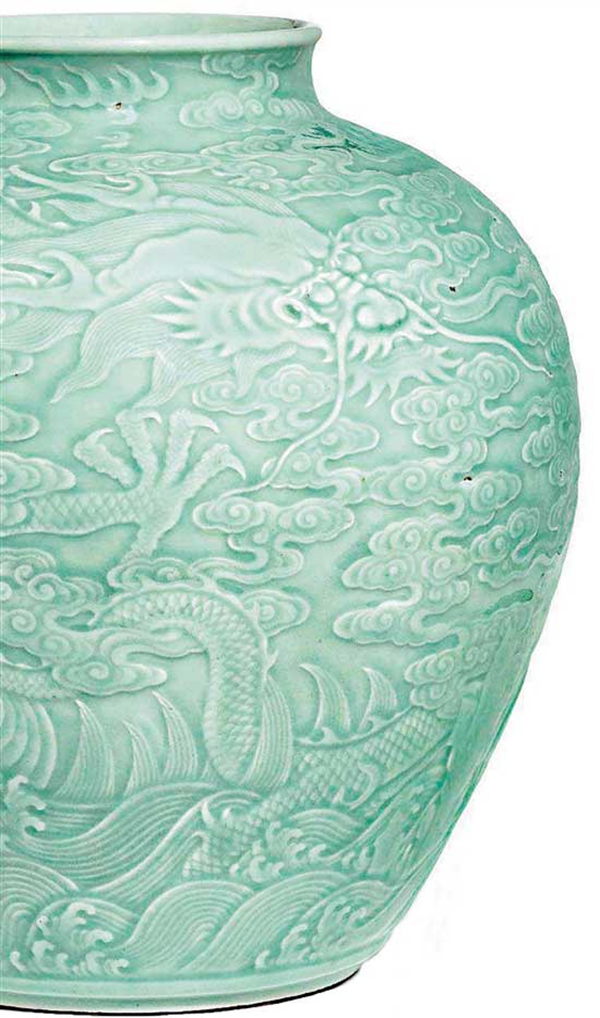 清乾隆 粉青釉浮雕“蒼龍教子”圖罐