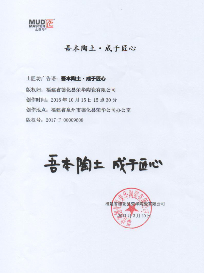 土匠坊廣告語:吾本陶土·成于匠心 版權(quán)歸:福建省德化縣榮華陶瓷有限公司 創(chuàng)作時間:2016年10月15日15點30分 創(chuàng)作地點:福建省泉州市德化縣榮華公司辦公室 版權(quán)號:2017-F-00009608
