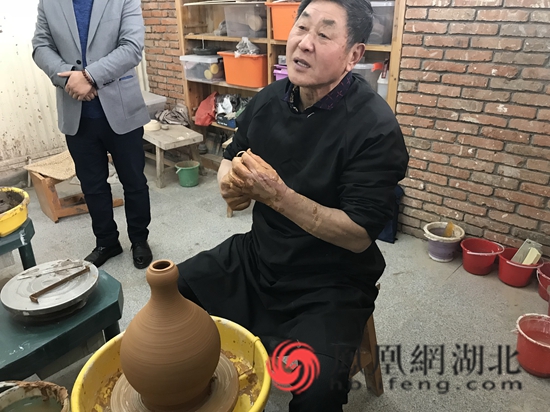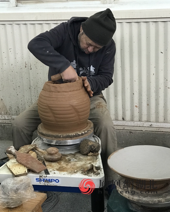 何老清晨到達陶藝館后一直在工作臺前制陶,摞泥、拉坯,有條不紊,與一旁的韓國陶藝家金相基還不時交流幾句,“韓國的制陶工藝跟我們還是有區(qū)別的,陶土也不一樣,希望他們有時間能去我們官窯鎮(zhèn)看看楚陶的技藝。”