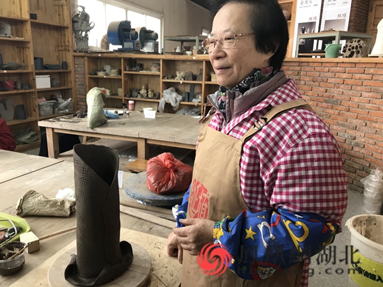 “現(xiàn)在年紀大了嘛,只能用盤條的形式做陶藝了。”今年70歲的黃美莉老師來自中國香港特別行政區(qū),做采訪時她正在創(chuàng)作手中的泥板卷桶,大塊的陶土對于現(xiàn)在的黃老師老說體力上有點吃不消,才用盤條的方式會相對輕松一些,“年輕的時候我住在英國,隔壁鄰居是一位藝術家,我那時候經(jīng)常去他們家里玩,之后就跟著他學,后來回到香港,也去了很多地方學,到現(xiàn)在做陶有四十多年了。”黃老師告訴我們,跟武漢的緣分從十二年前就開始了,“十二年期我來武漢教學生們雕塑,這一次來感覺這里發(fā)展的很快,設備、環(huán)境都有了很大的改善。”