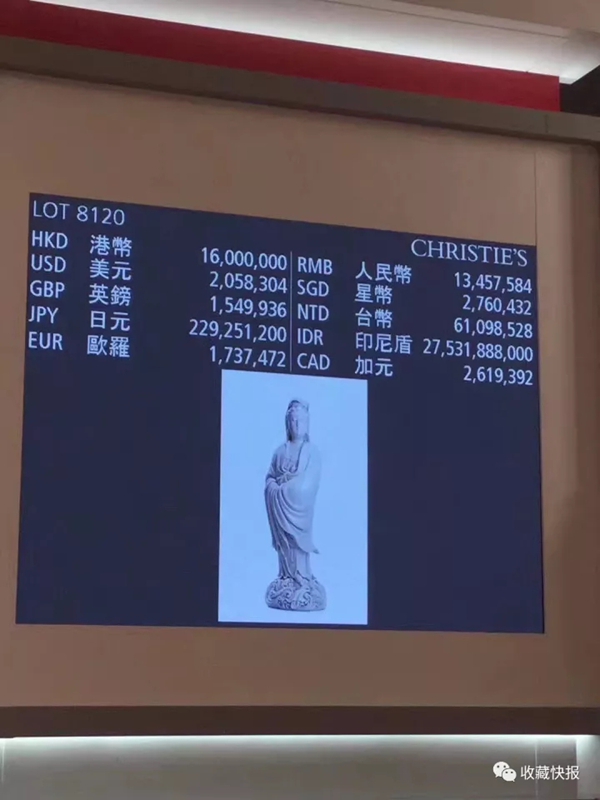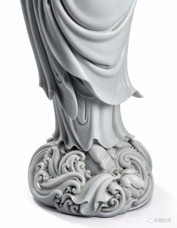 昨日,在香港佳士得2017秋季拍賣會(huì)舉行的“御苑·文心·匠藝——明代器物書畫晚間拍賣”專場(chǎng)上,“明代瓷圣”何朝宗創(chuàng)作的德化窯白釉渡海觀音以1600萬(wàn)港元落槌,超越2014年香港佳士得1444 萬(wàn)港元成交的何朝宗渡海達(dá)摩像,創(chuàng)下迄今為止德化白瓷拍賣世界紀(jì)錄,此前,該尊觀音像估價(jià)1000萬(wàn)至1500萬(wàn)港元。市場(chǎng)對(duì)于德化白瓷以及何朝宗瓷塑的認(rèn)識(shí)度達(dá)到了一個(gè)新的高度。