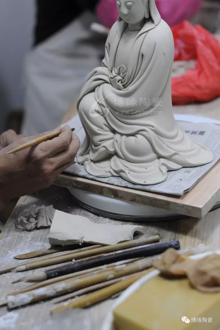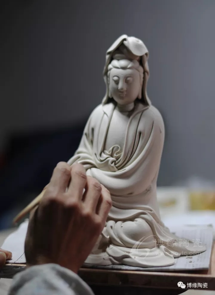 何派觀音雕塑注重于細(xì)節(jié)之美,精益求精,故而十分著意衣紋的刻畫,使線條流暢,翻轉(zhuǎn)自然。觀其佛像,仿佛有春風(fēng)拂面,衣袂飄揚(yáng)的出塵之感。而今德化陶瓷觀音作品,在繼承前人優(yōu)秀技法和何派風(fēng)格的同時,不斷創(chuàng)新發(fā)展,賦予作品新的現(xiàn)代生活氣息,使作品更加貼近生活。