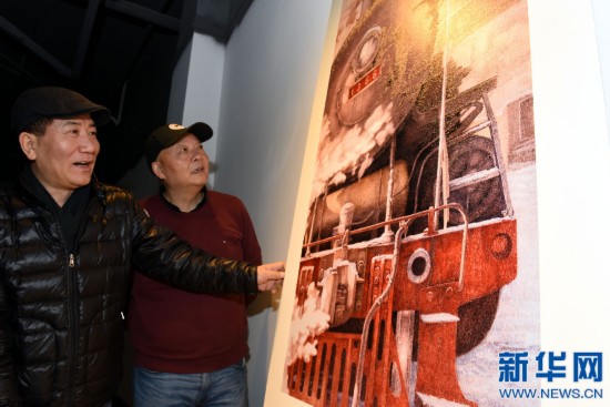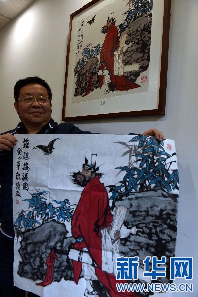 12月8日,著名畫家、江西美術(shù)家協(xié)會(huì)名譽(yù)主席蔡超在展示國畫原作(下)和“瓷上版畫”作品(上)。新華社記者宋振平攝