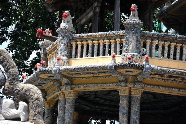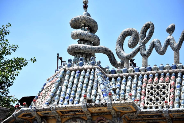 這座瓷房子歷史悠久,幾經(jīng)易主,由現(xiàn)在的主人設(shè)計而成,特色鮮明,4層小洋房,外墻、房頂、窗欞、門楣,所有能看到的部分全被瓷片和瓷器覆蓋。沿屋頂房脊有一條龍形雕塑,長逾百米蜿蜒而下,龍身亦全用瓷片裹成。