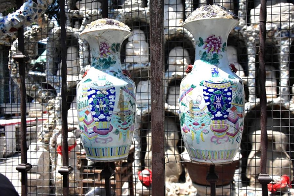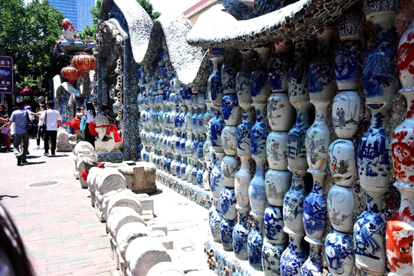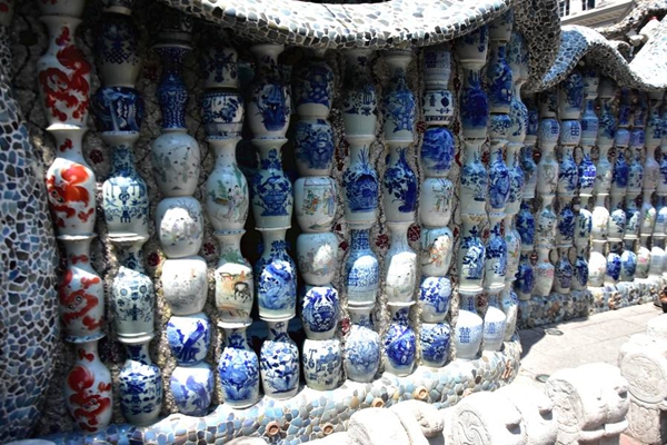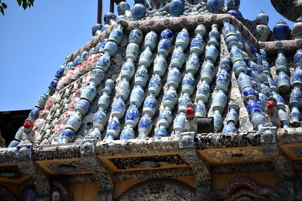 瓷房子所用瓷器和瓷片年代從漢代一直跨越到清代,窯址除五大名窯外還有龍泉窯、耀州窯等,中國所有官窯、民窯瓷的種類幾乎都可以在這里看到。瓷房子不僅用了大量的瓷片,還用了好多現(xiàn)成的瓷器,看看眼前巨大的瓷瓶,內(nèi)行人能看出是哪個朝代的嗎?