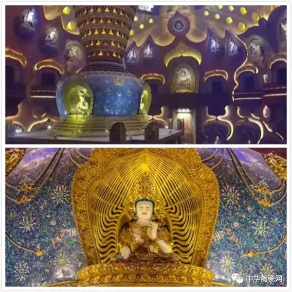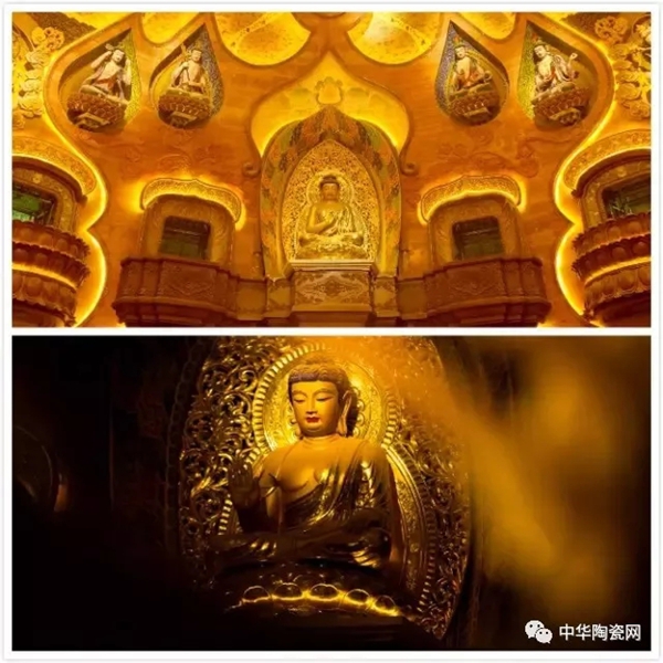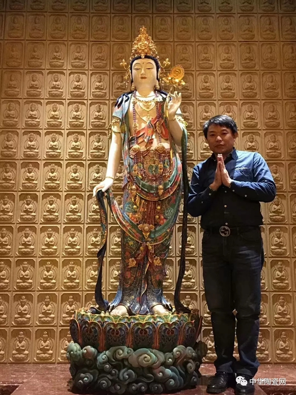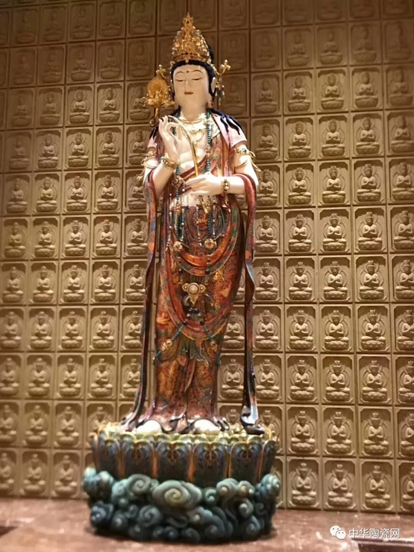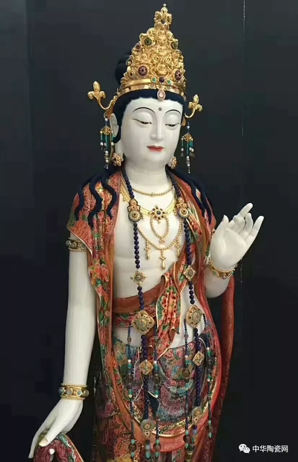 燒制完成之后,還要由莆田工藝大師吳立波進(jìn)行彩繪和鑲嵌,包括表面巖彩金線(xiàn)鑲嵌,瓔珞、蓮臺(tái)、背光局部巖彩鑲嵌等。
