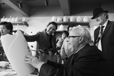 據(jù)悉,洞上陶藝村改制于原三班鎮(zhèn)蔡徑村辦瓷廠,自2013年11月成立陶藝村以來,已吸引各地30多名藝術(shù)家成立創(chuàng)意工作室23家、陶藝DIY體驗(yàn)區(qū)4處,年接待游客近8萬人次。圖為德國(guó)友人在陶瓷坯體上簽名。