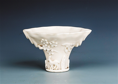 仿犀角杯是德化白瓷的常見器形,其造型源于飲酒所用的犀角杯。犀角杯在有明一代即是稀罕之物,曹昭《格古要論·珍奇論》中言:“犀角,出南蕃、西蕃,云南亦有。成株肥大、花兒好及正透者價(jià)高……凡器皿,需要雕琢功夫及樣范好。”《明史·卷六十七·輿服三》中有“二品,六梁,革帶,授環(huán)犀,余同一品”的記載,即明朝二品官員的官服腰帶是由犀角制成,足見其材質(zhì)珍貴。以白瓷仿犀角,既得犀角之形,相對(duì)廉價(jià),又另呈一番瓷韻美感,不得不贊嘆德化制瓷藝人的獨(dú)具匠心。