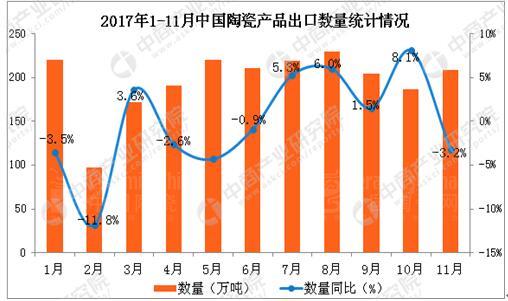 據(jù)中商產(chǎn)業(yè)研究院發(fā)布的《2017-2022年中國(guó)陶瓷產(chǎn)品行業(yè)市場(chǎng)前景及投資機(jī)會(huì)分析報(bào)告》數(shù)據(jù)統(tǒng)計(jì)統(tǒng)計(jì)顯示:2017年11月中國(guó)出口陶瓷產(chǎn)品209萬(wàn)噸,同比下滑3.2%;1-11月中國(guó)出口陶瓷產(chǎn)品出口2151萬(wàn)噸,與去年同期相比增長(zhǎng)2%。