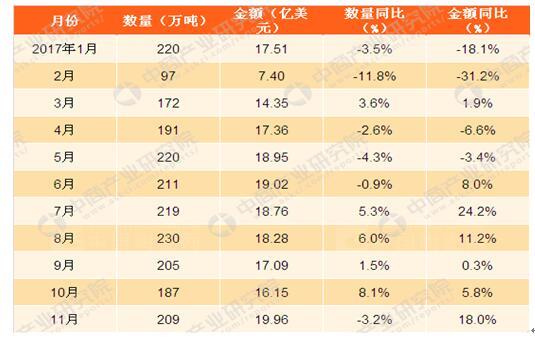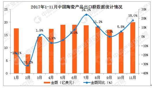 11月中國(guó)陶瓷產(chǎn)品出口金額19.96億美元,同比增長(zhǎng)18%;1-11月,我國(guó)陶瓷產(chǎn)品出口金額達(dá)176.17億美元,同比增長(zhǎng)9.7%。