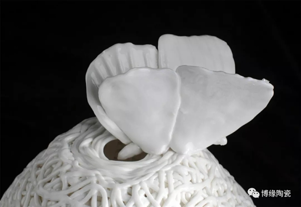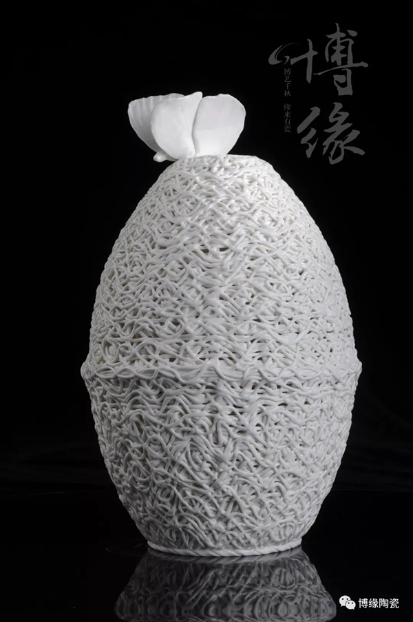 作品采用純手工編織藤條鏤空技術(shù),用陶瓷泥土手工搓線,手工搓成粗細(xì)均勻大小線條,在搓線過程中需要嚴(yán)格控制水分和軟硬程度,否則極易斷裂,這是手工編織開始重要的一步。