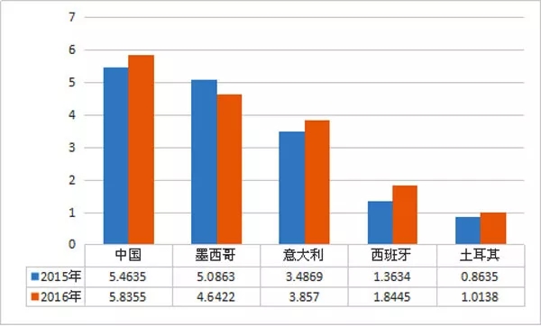 2015~2016年美國瓷磚進(jìn)口前五國情況