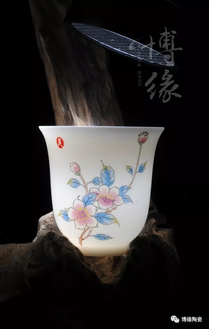 和善靜美玉瓷杯,精選3-5萬元每噸原瓷泥料,經(jīng)過精心加工,其含雜質(zhì)少,瓷質(zhì)白,白度高達(dá)95%,是白瓷中之精品,在光照之下,白如凝脂,透潤如玉,胎釉透亮。