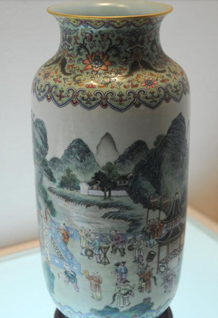 瓶身似圓形長(zhǎng)燈籠,外壁用粉彩繪有庭院嬰戲圖,遠(yuǎn)處山巒起伏,近處有小橋、流水、亭臺(tái)、古松,三十個(gè)衣著艷麗的童子或手持福字燈,或燃放鞭炮,或敲鑼打鼓,在庭院中嬉戲玩耍。