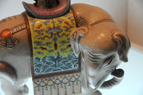 象作回首狀,施米灰色釉,棕毛畢現(xiàn),元寶形鞍上馱有葫蘆形琺瑯寶瓶。這是宮廷中常見(jiàn)的陳設(shè)器,象是太平盛世的象征,象馱寶瓶喻意“太平有象”。