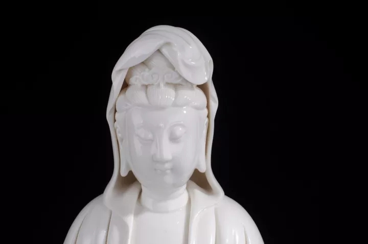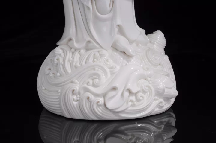 簡介:該《渡海觀音》由中國青年陶瓷藝術(shù)家設(shè)計(jì)制作,以德化特有的溫潤如玉的“中國白”為胎質(zhì),純手工制作,作品圓勁有力如凝脂似玉,滋潤瑩滑,神情嫻雅平靜,安詳自若,雙目低垂凝思,衣紋線條清晰、簡潔、瀟灑,多變化,柔媚流暢,翻轉(zhuǎn)自然,觀音雙手藏袖,露一足踏蓮花,另一足水花掩蓋,作踏浪凌波渡海之勢刻畫的栩栩如生。經(jīng)高溫1300多度燒制,整尊造像美倫美煥,活靈活現(xiàn),是一件上乘之品。