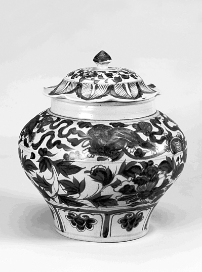 玉溪市博物館藏玉溪窯青花獅子滾繡球紋蓋罐(光明日報圖片)