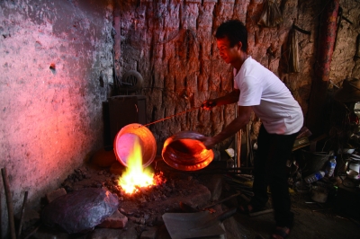江川制銅業(yè)歷史悠久,新河嘴村和漁村打制銅器的歷史可追溯到600年前。出于生活的需要,村民以黃銅、紫銅為原料,鍛打炊鍋、臉盆、茶盤、茶壺及碗筷等生活用具。隨著時代的變遷,加之種種歷史原因,這一民間工藝一度斷層多年,到上世紀九十年代初,整個江川僅有幾名藝人打制炊鍋、臉盆、茶盤、茶壺、墨盒、碗筷湯匙等器皿,且多為自用或供親朋好友使用。1993年后,由于市場需求的擴大,江川青銅文化開始在民間慢慢復(fù)蘇。