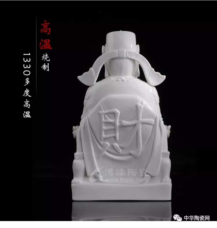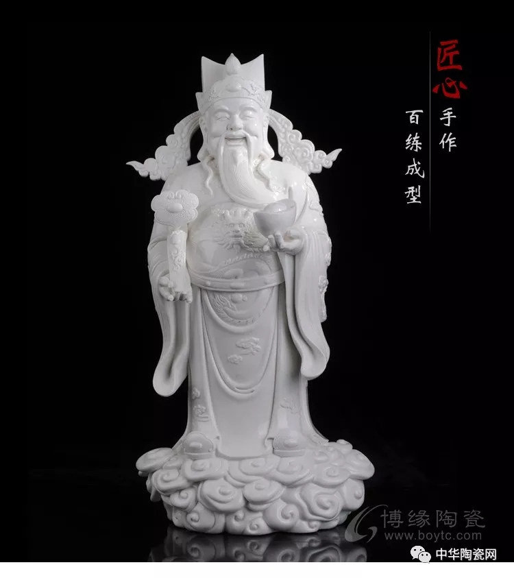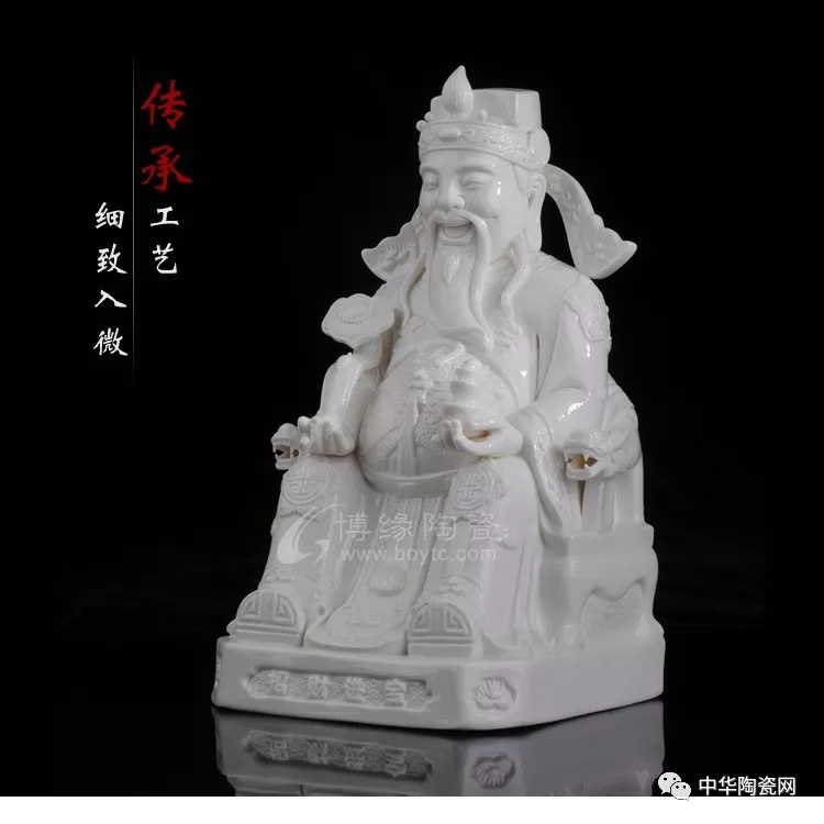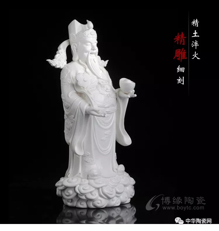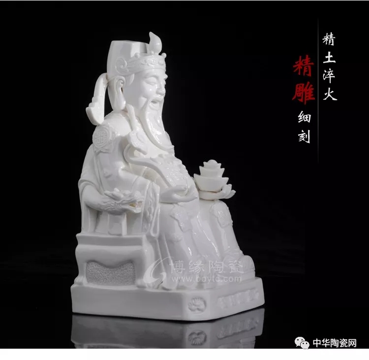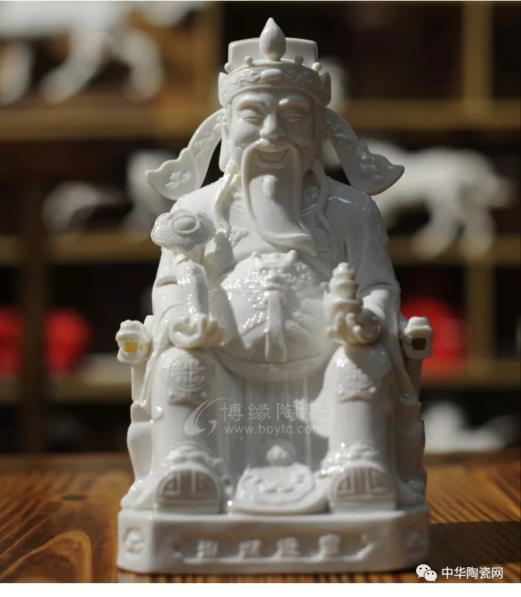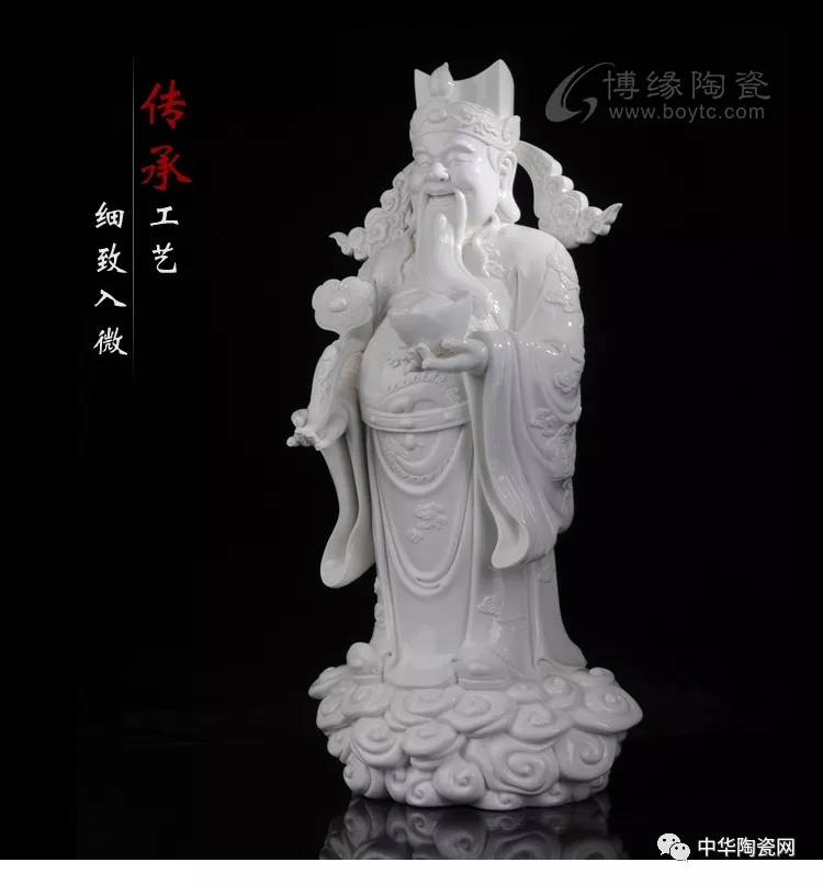 財(cái)神佛像是德化窯瓷塑藝術(shù)的常見題材之一。德化瓷塑在中國陶瓷史上久負(fù)盛名,它用優(yōu)質(zhì)的白瓷塑造神態(tài)各異的人物,以純凈瑩潤的釉色和生動傳神的形象取勝,摒棄彩繪而追求單純的雕塑美和原材料的質(zhì)地美,獨(dú)具藝術(shù)風(fēng)韻。